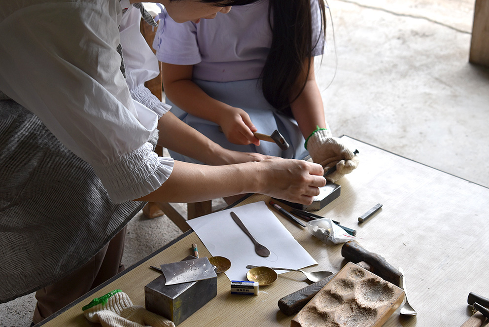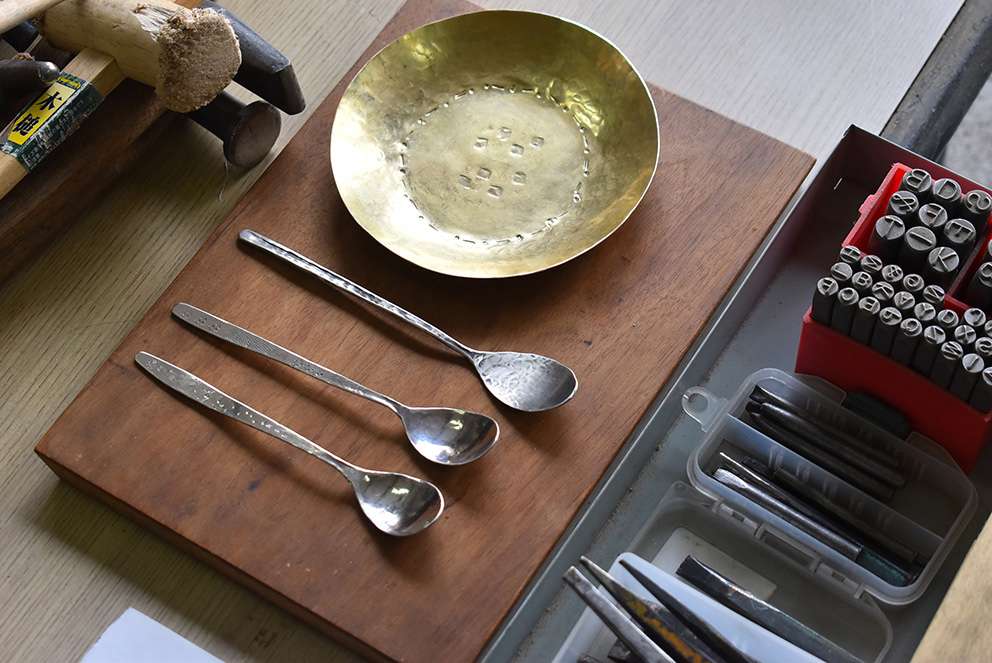 【 制作内容 】 洋白(銀色)のティースプーン、真鍮(金色)直径14センチのプレート、 またはバターナイフ(真鍮or洋白)どれか1点。 当日にサンプルを見ながらお選びいただけます。 金づちの模様もいろいろあります。自分のイニシャルを刻印で入れたり、模様をつけたりして、 オリジナルの作品を制作できます。出来た作品はその日に持ち帰ることができます。 制作時間はデザインにより個人差がありますが、1.5〜2時間です。 【 価格 】 ¥4,400 (税込)