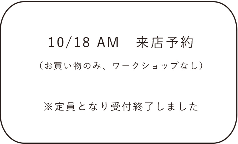 ※10/18午後〜19 ワークショップ中はお店部分は閉めています。 ワークショップご予約の方は終了後にお店にもご案内しますので、 この来店予約は必要ありません。